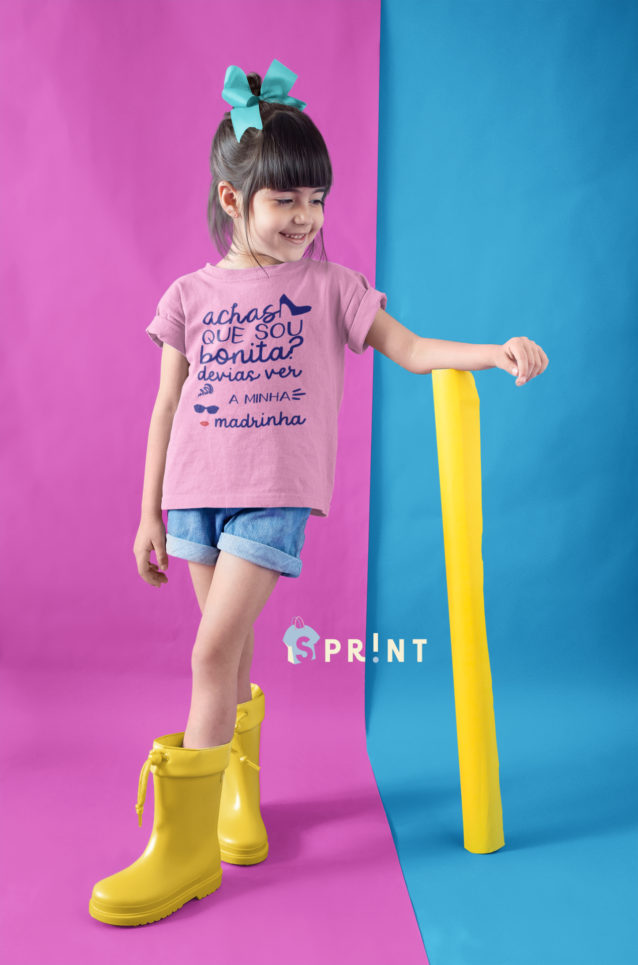 Camisola rosa para criança com texto em português e botas amarelas sobre fundo roxo e azul.