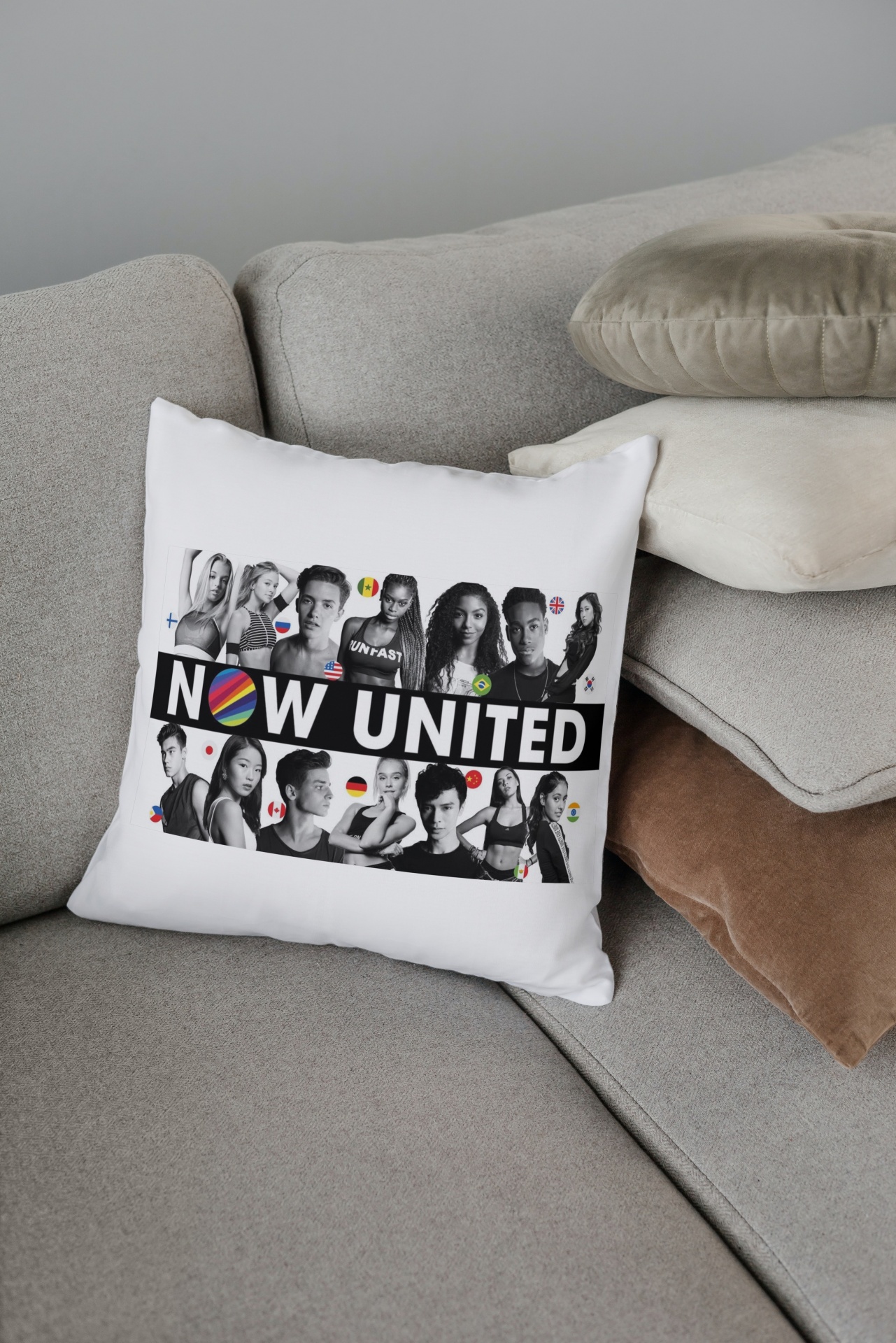 Almofada branca com imagem e texto 'NOW UNITED' sobre sofá cinzento, com outras almofadas de cores neutras ao lado.