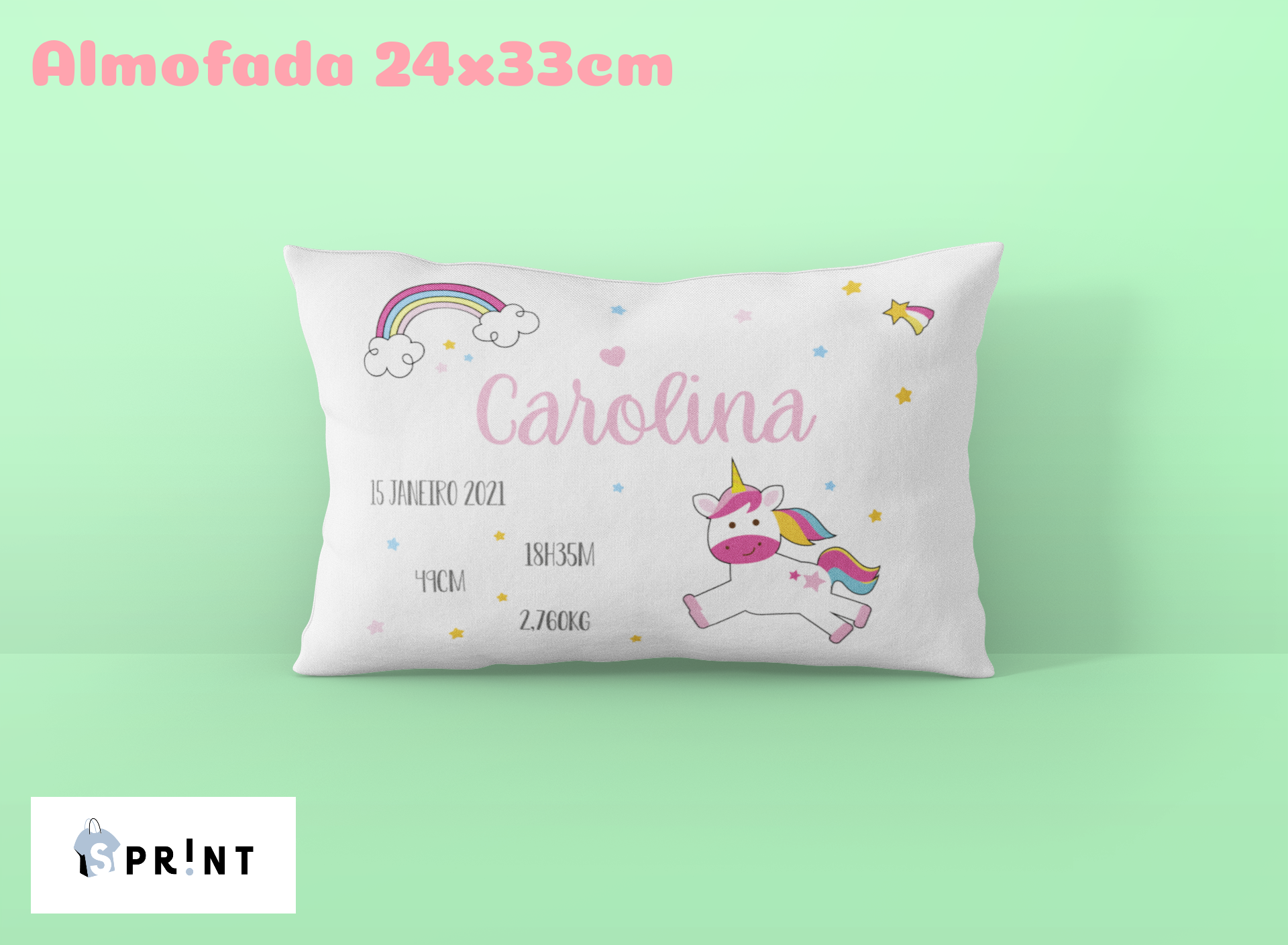 Almofada branca com estampa de unicórnio e texto personalizado sobre fundo verde claro
