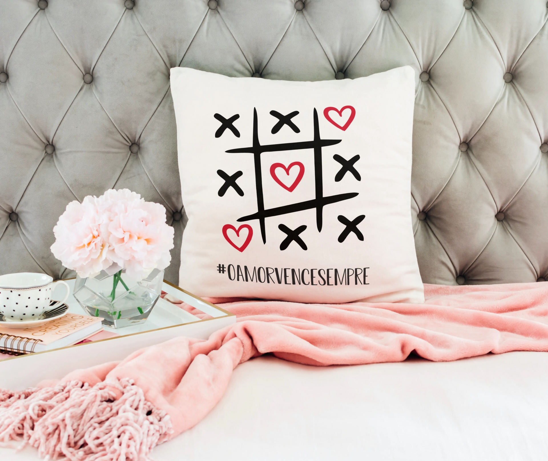 Capa de almofada branca com jogo do galo e corações vermelhos, texto '#OAMORVENCENSEMPRE', sobre cama com manta rosa e flores em vaso
