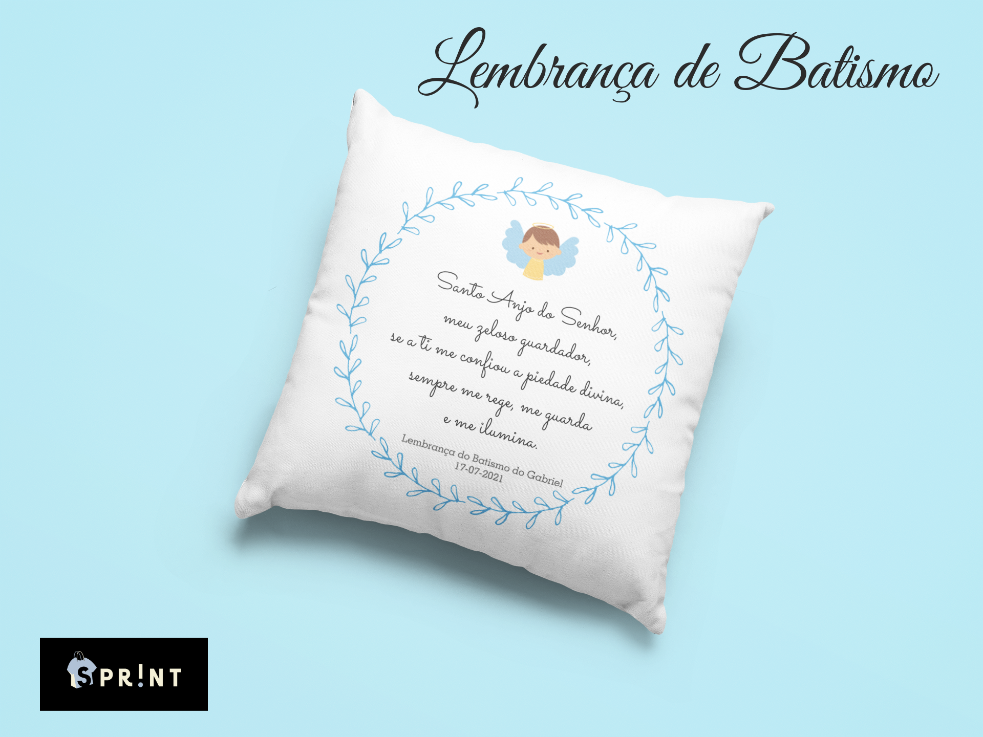 Almofada branca com estampa floral, anjo e texto, lembrança de batismo