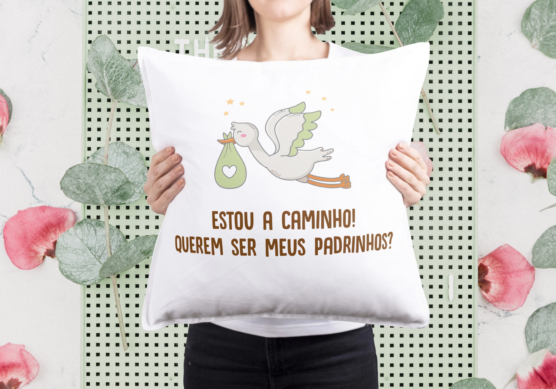 Travesseiro branco com estampa de cegonha e texto em castanho, segurado por pessoa sentada em sofá verde-azul.
