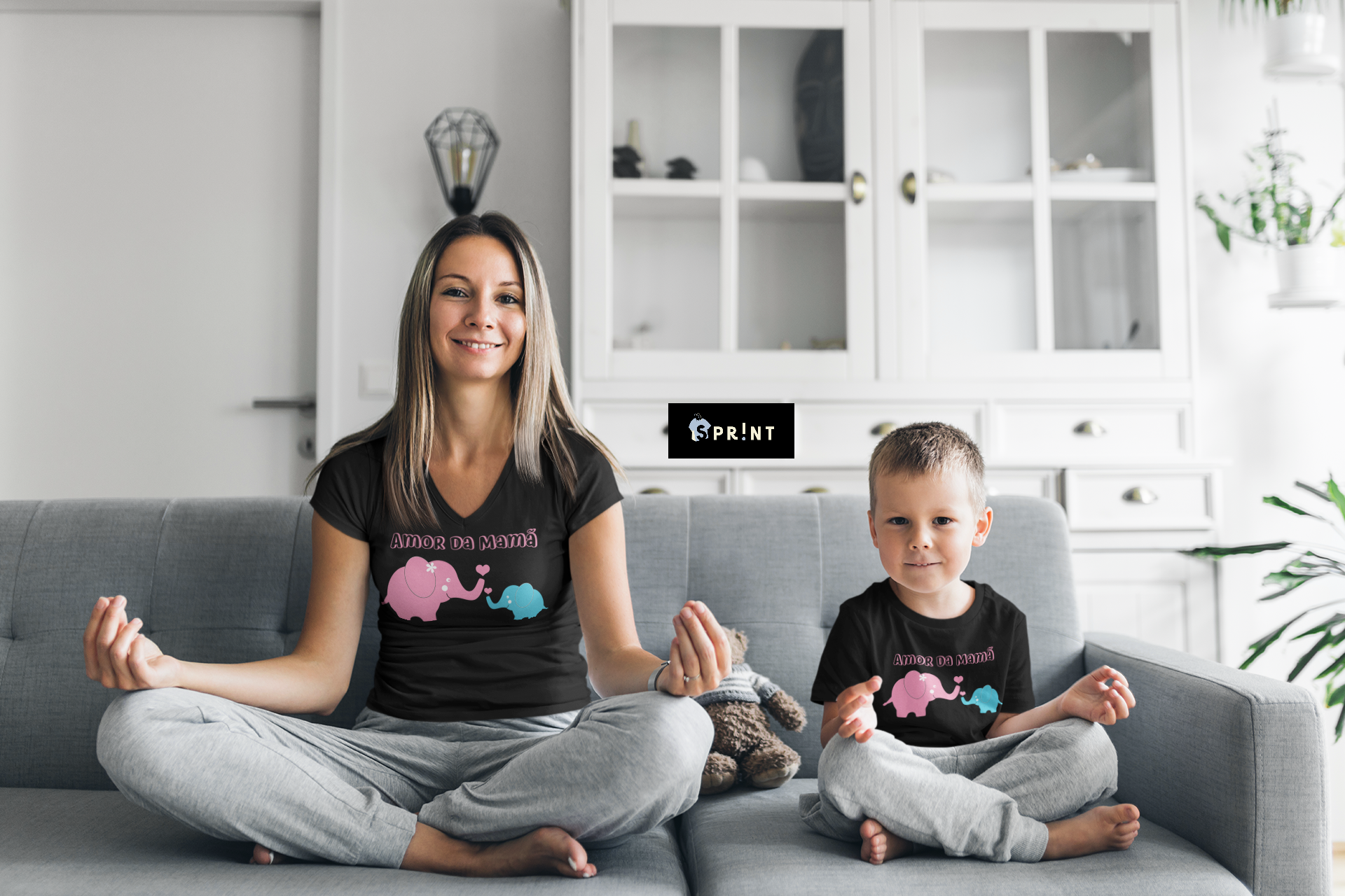 Mulher e criança com t-shirts pretas sentados num sofá cinzento em sala de estar