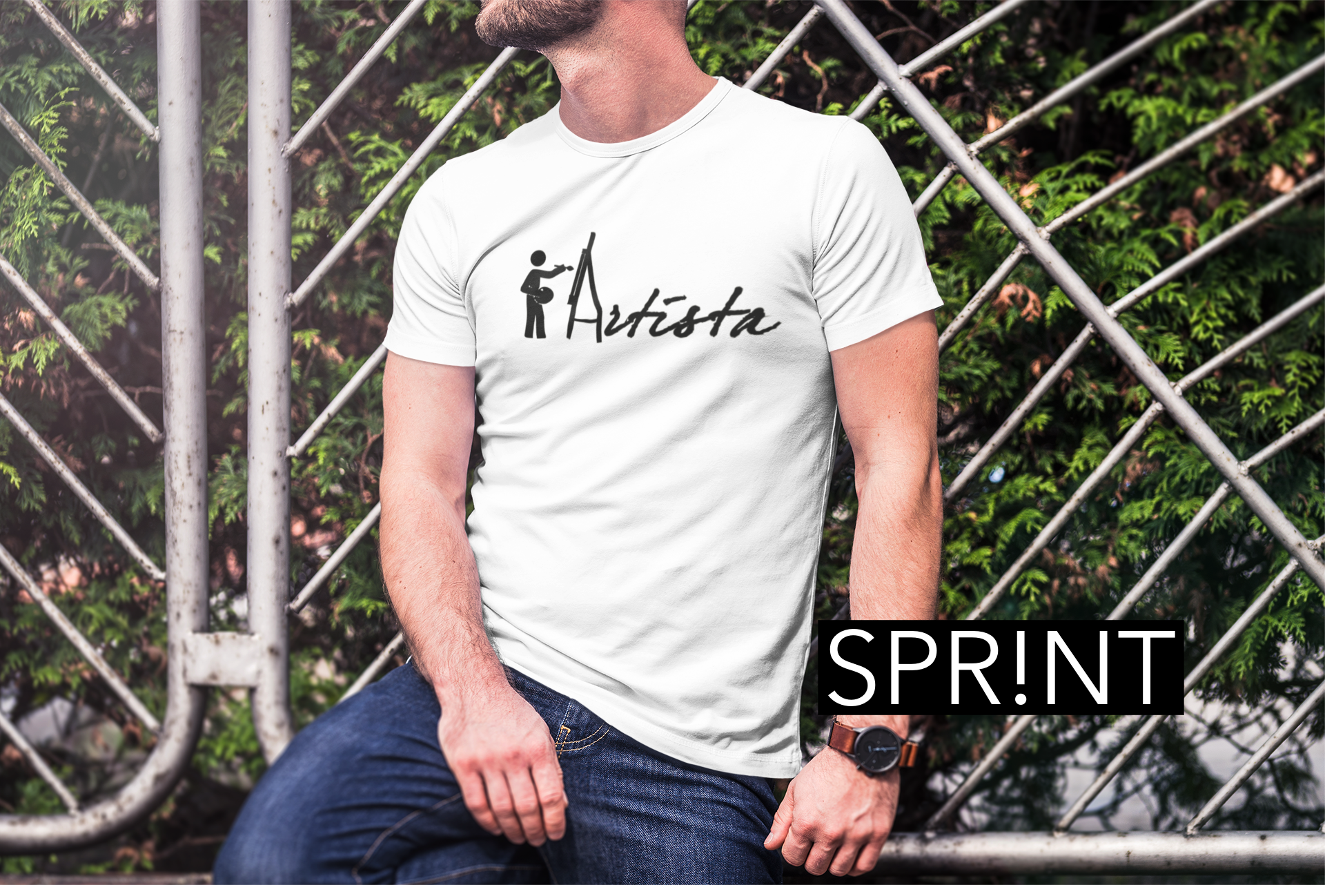Homem com t-shirt branca 'Artista' sentado junto a cerca metálica com plantas