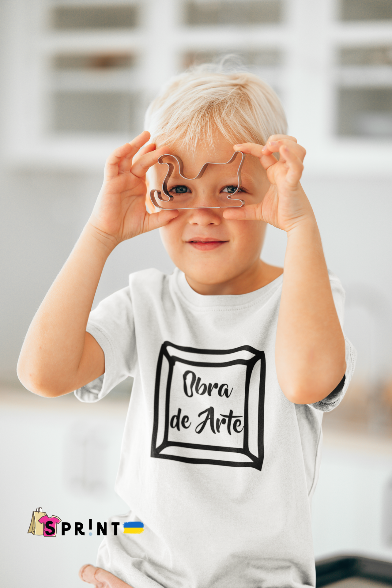 Criança loira com camisola branca 'Obra de Arte' segurando cortador de biscoitos em forma de cachorro