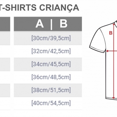 Tabela de tamanhos de T-shirts para crianças com medidas A e B e ilustração de uma t-shirt branca