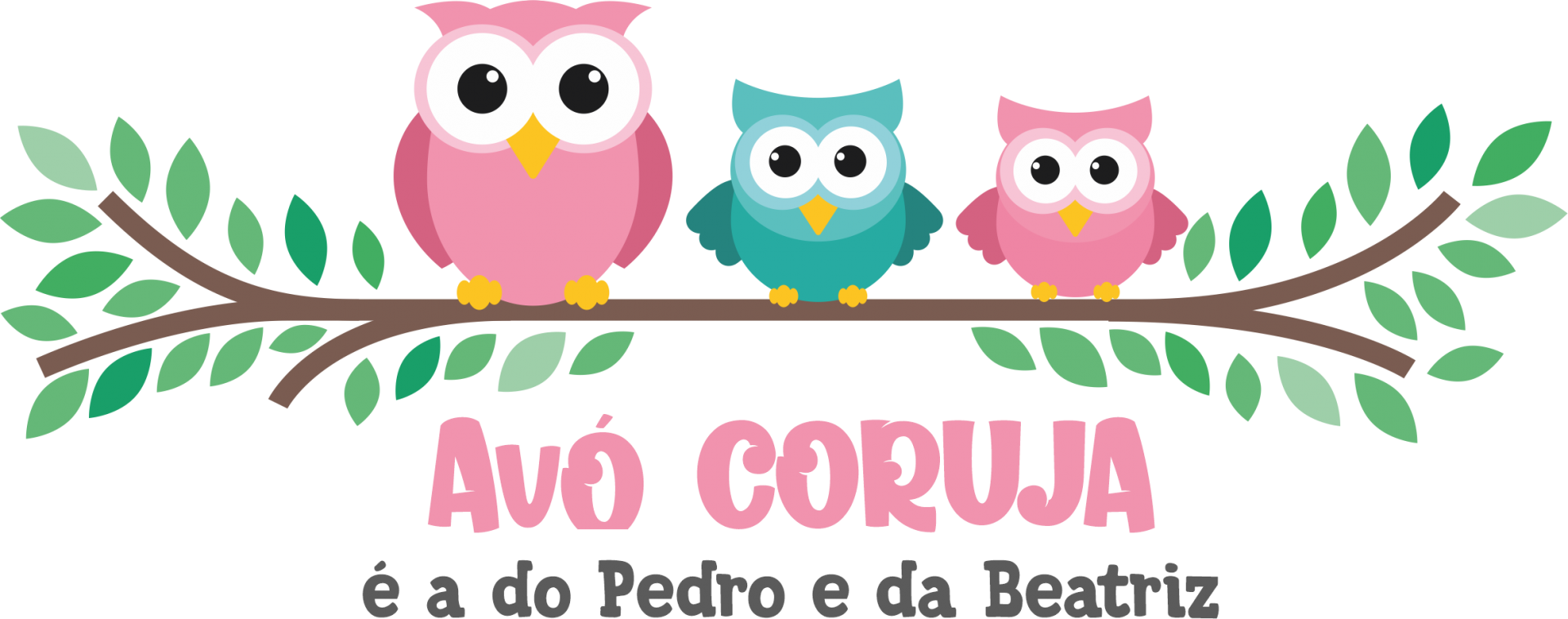 Imagem gráfica de três corujas coloridas sobre uma rama com folhas e texto em rosa.