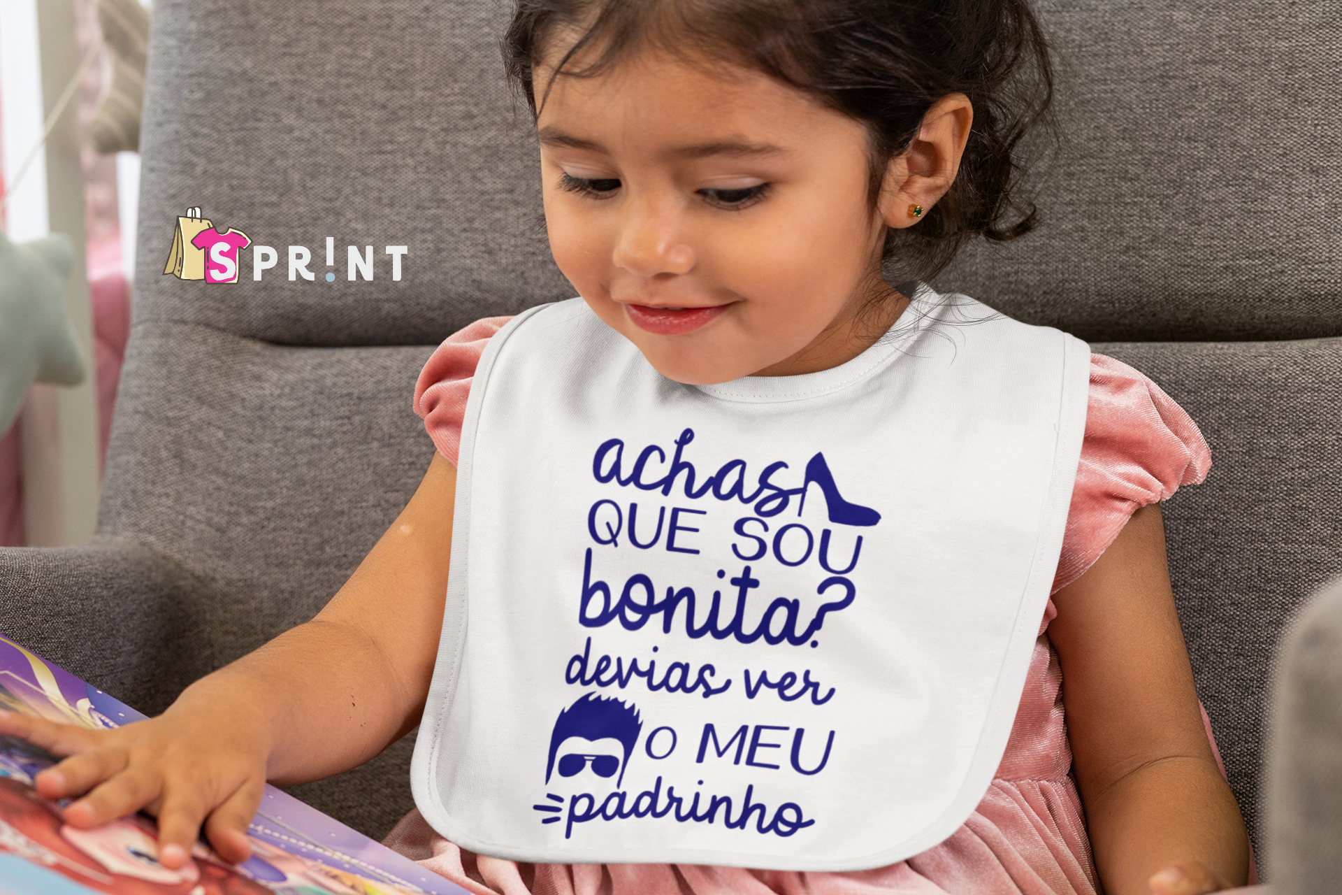 Bebé com babete branco com frase azul a ler livro sentado em sofá cinzento