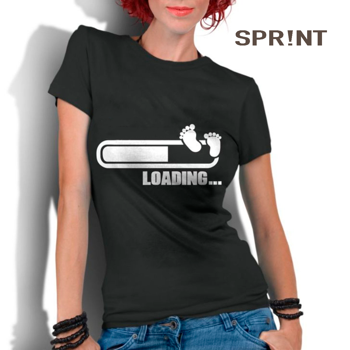 T-shirt preta com estampa de barra de progresso e texto LOADING... usada por mulher ruiva