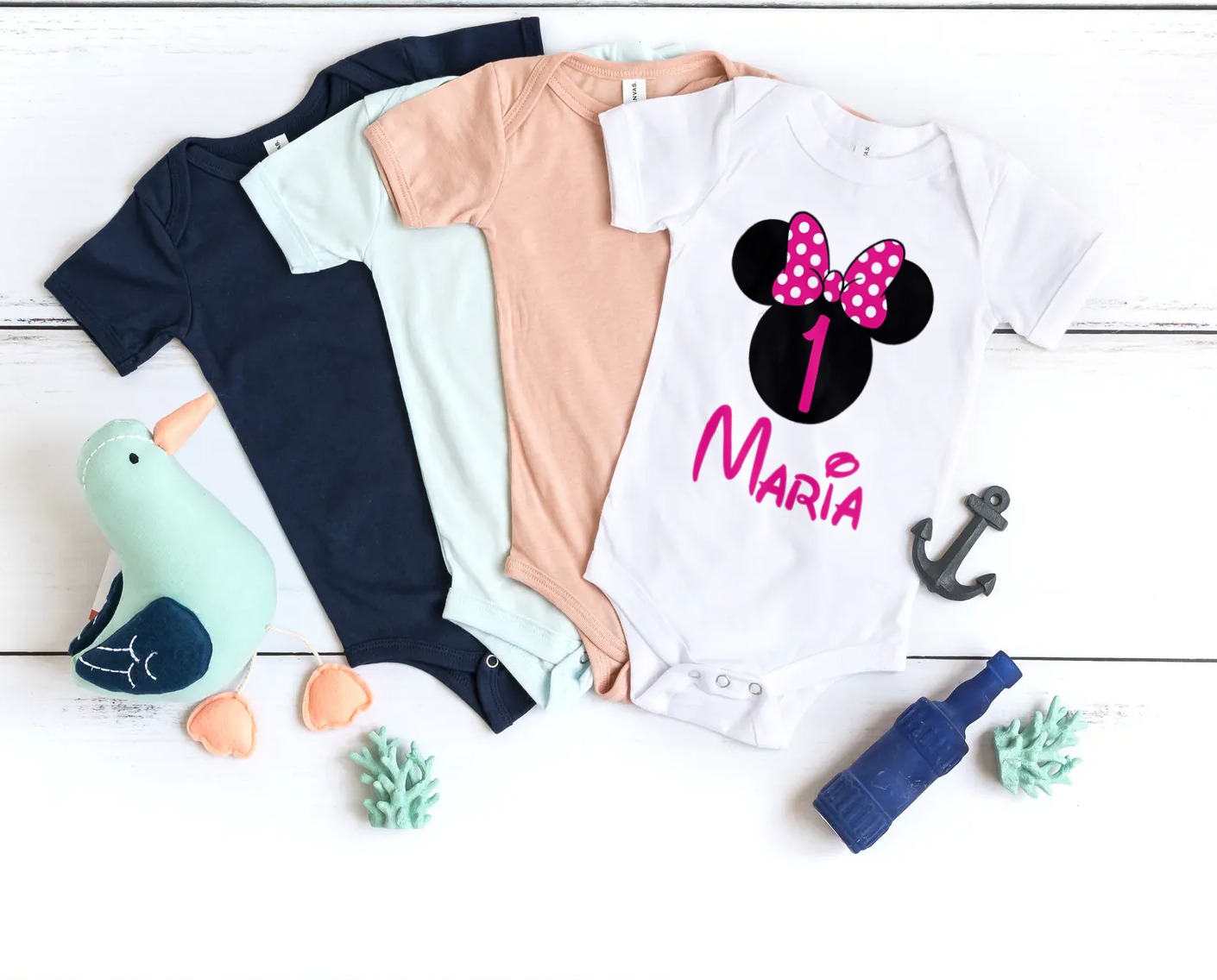 Quatro bodies de bebé de várias cores com brinquedos e decoração num fundo branco