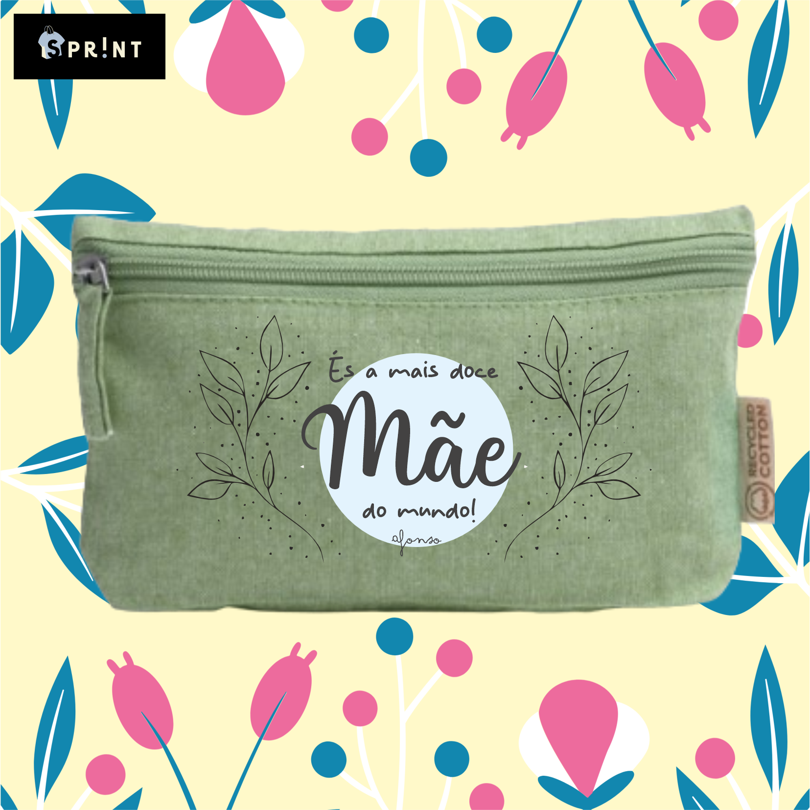 Necessaire verde com mensagem para mãe e padrão floral ao fundo