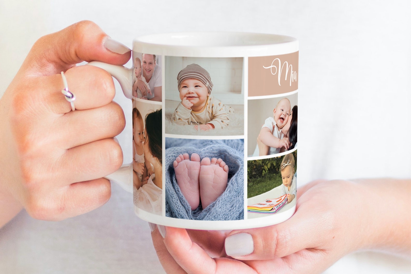 Caneca personalizada com fotos de bebés, mãos segurando