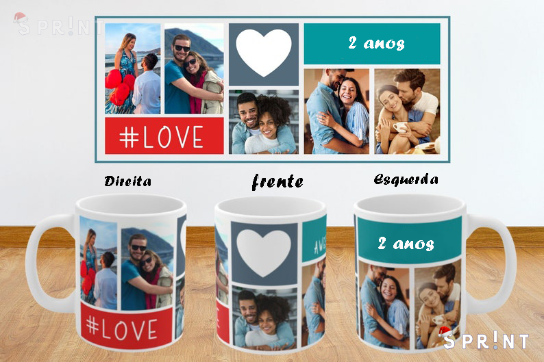 Caneca personalizada com fotos de casais, coração e texto #LOVE