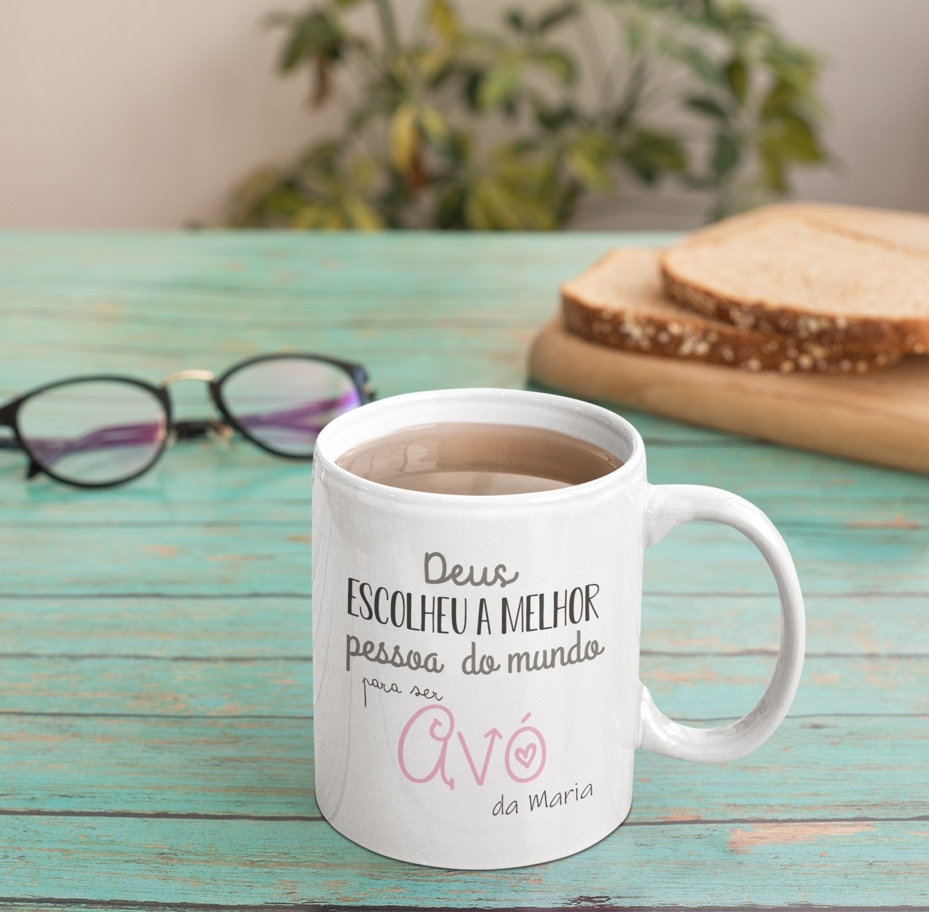 Caneca branca com texto em português sobre uma mesa de madeira verde clara, ao lado de óculos e pão.