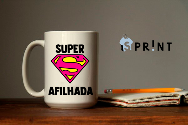 Caneca branca com símbolo do Super-Homem e frase SUPER AFILHADA ao lado de caderno e lápis