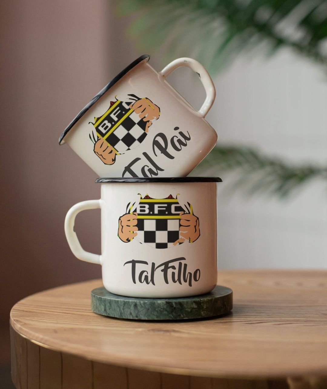 Dois copos esmaltados brancos com desenhos B.F.C. Tal Pai e Tal Filho