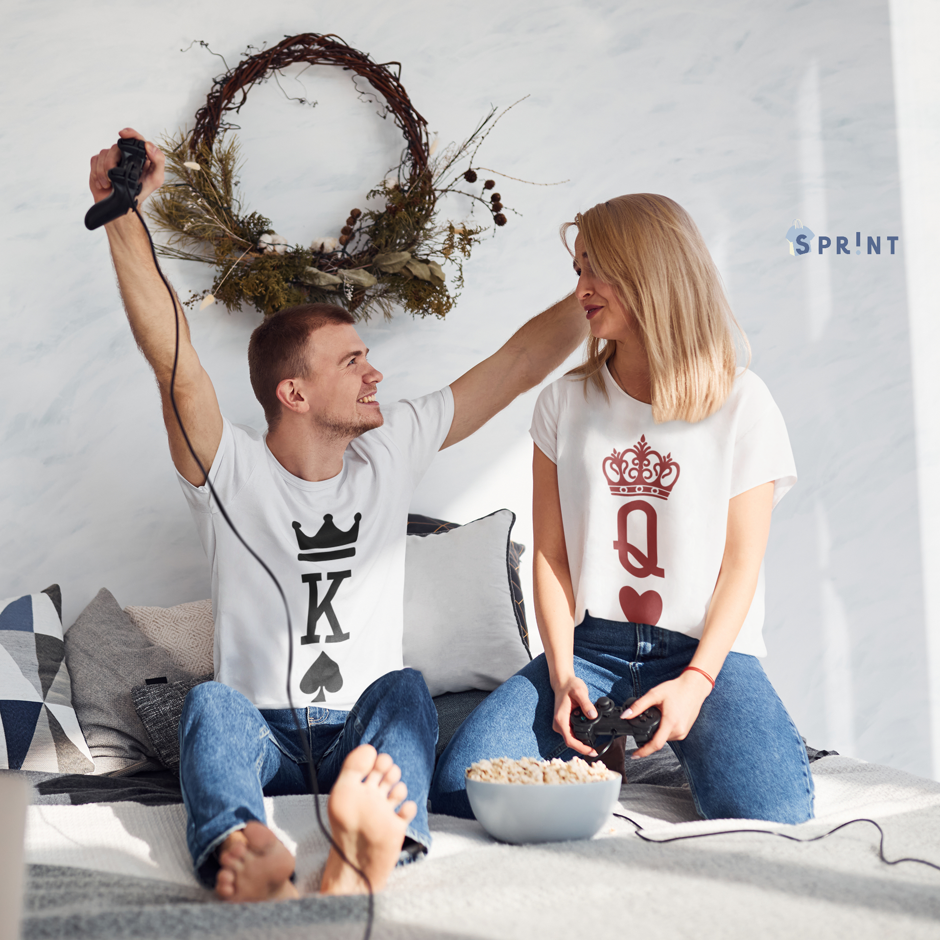 Casal a jogar videojogos com t-shirts de rei e rainha de baralho sentados no sofá