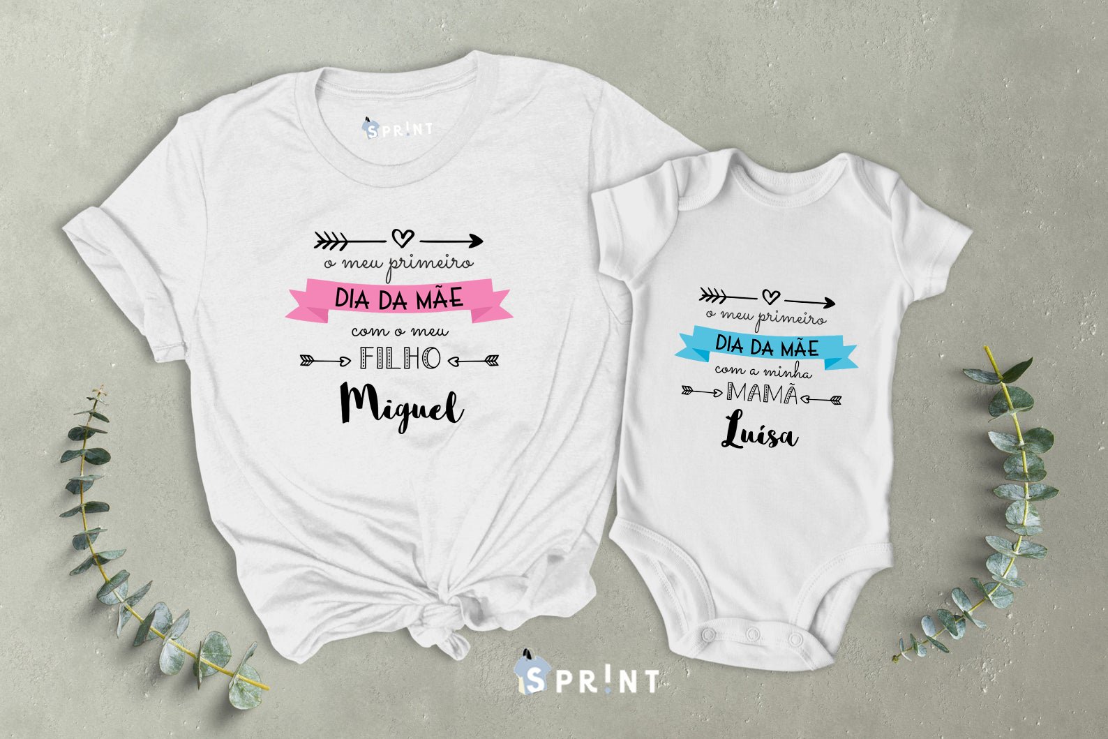 T-shirt e body branco com mensagens para o primeiro Dia da Mãe, decorados com texto em rosa e azul, sobre fundo cinza e plantas verdes ao redor.