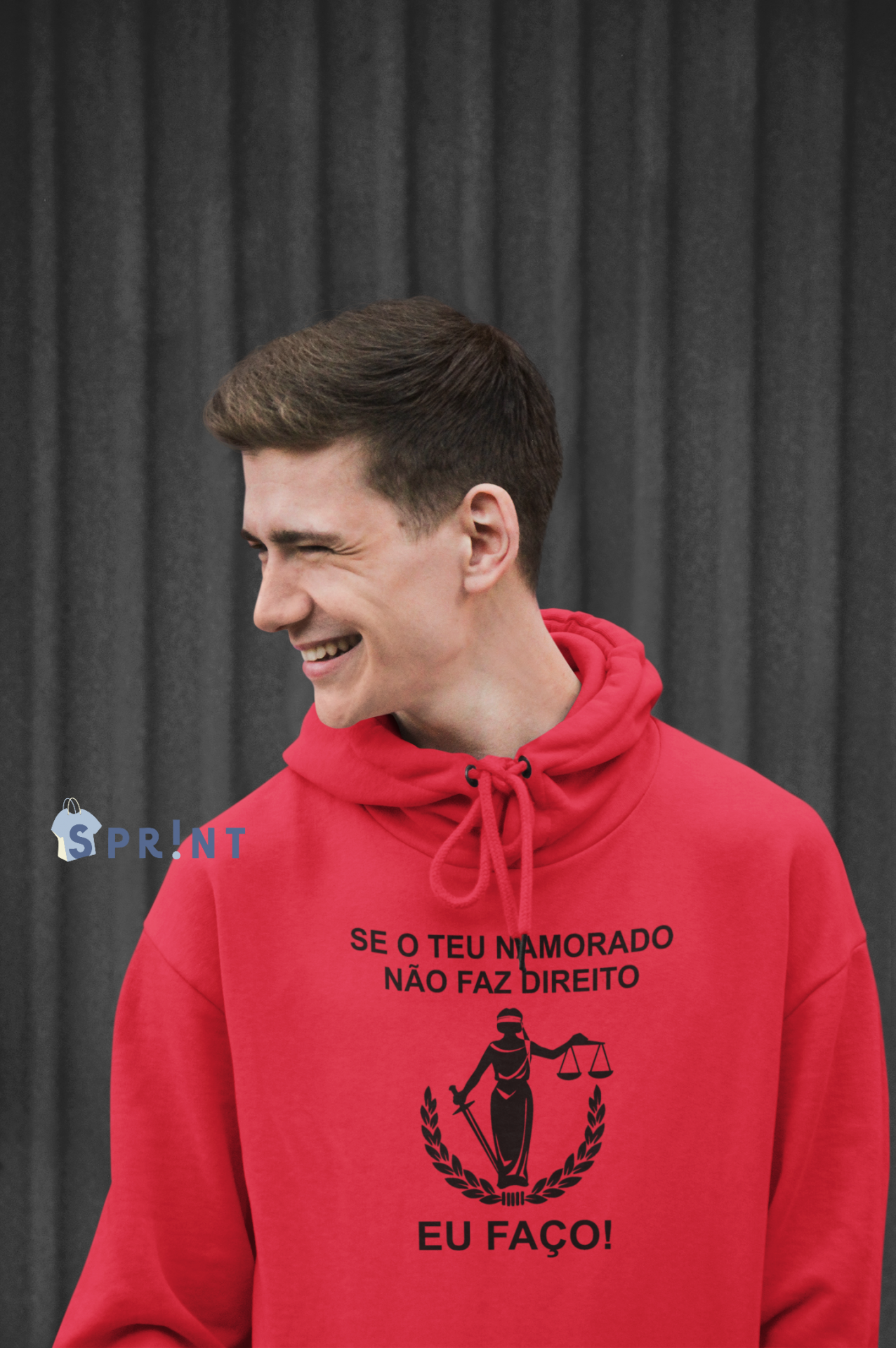 homem jovem a usar sweatshirt vermelha com texto e imagem da deusa da justiça
