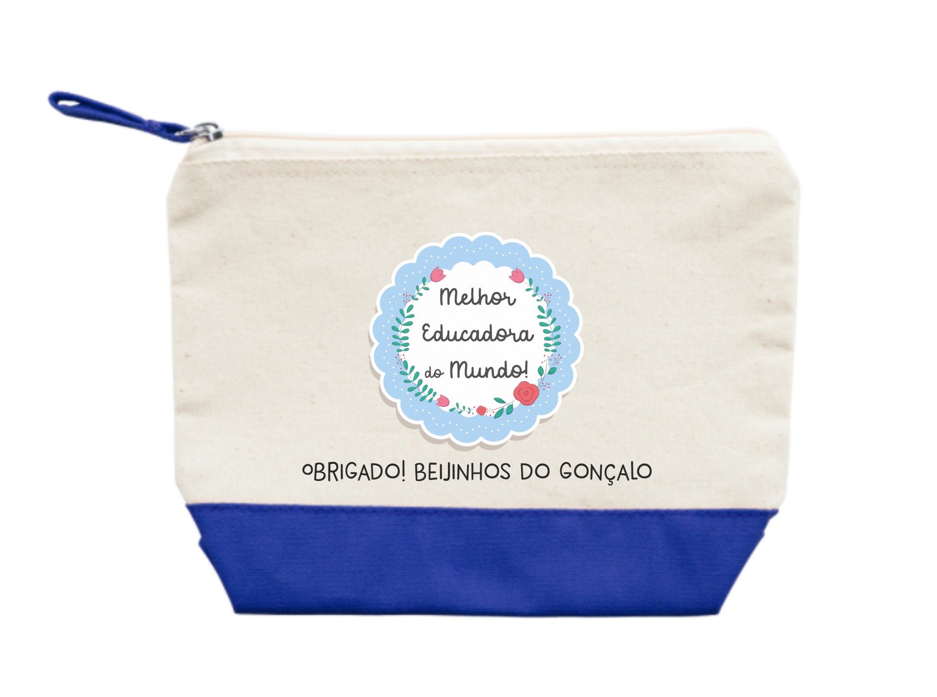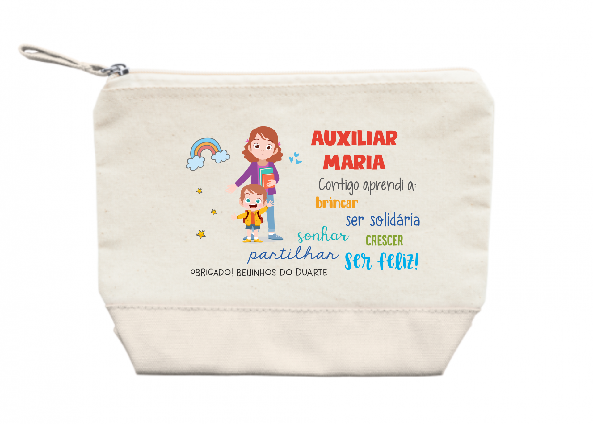 Estojo tecido creme com base vermelha e ilustração colorida de educadora e criança, texto em português.