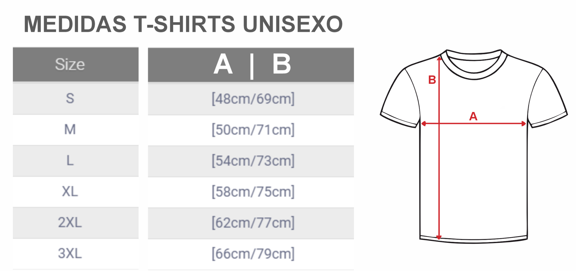 Tabela de medidas para T-shirts unisexo com esquema de medição
