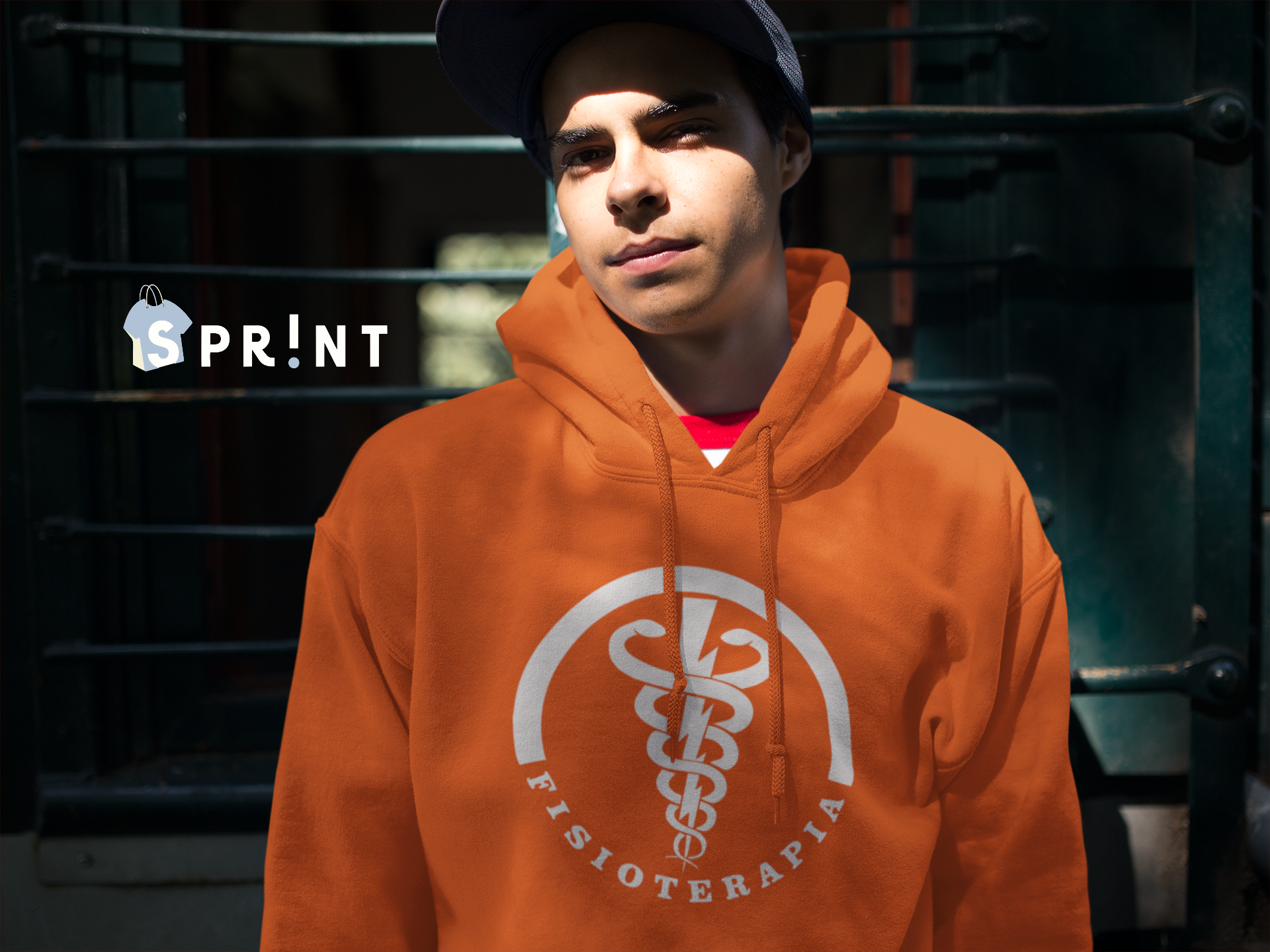 Jovem com hoodie laranja com símbolo branco e texto FISIOTERAPIA