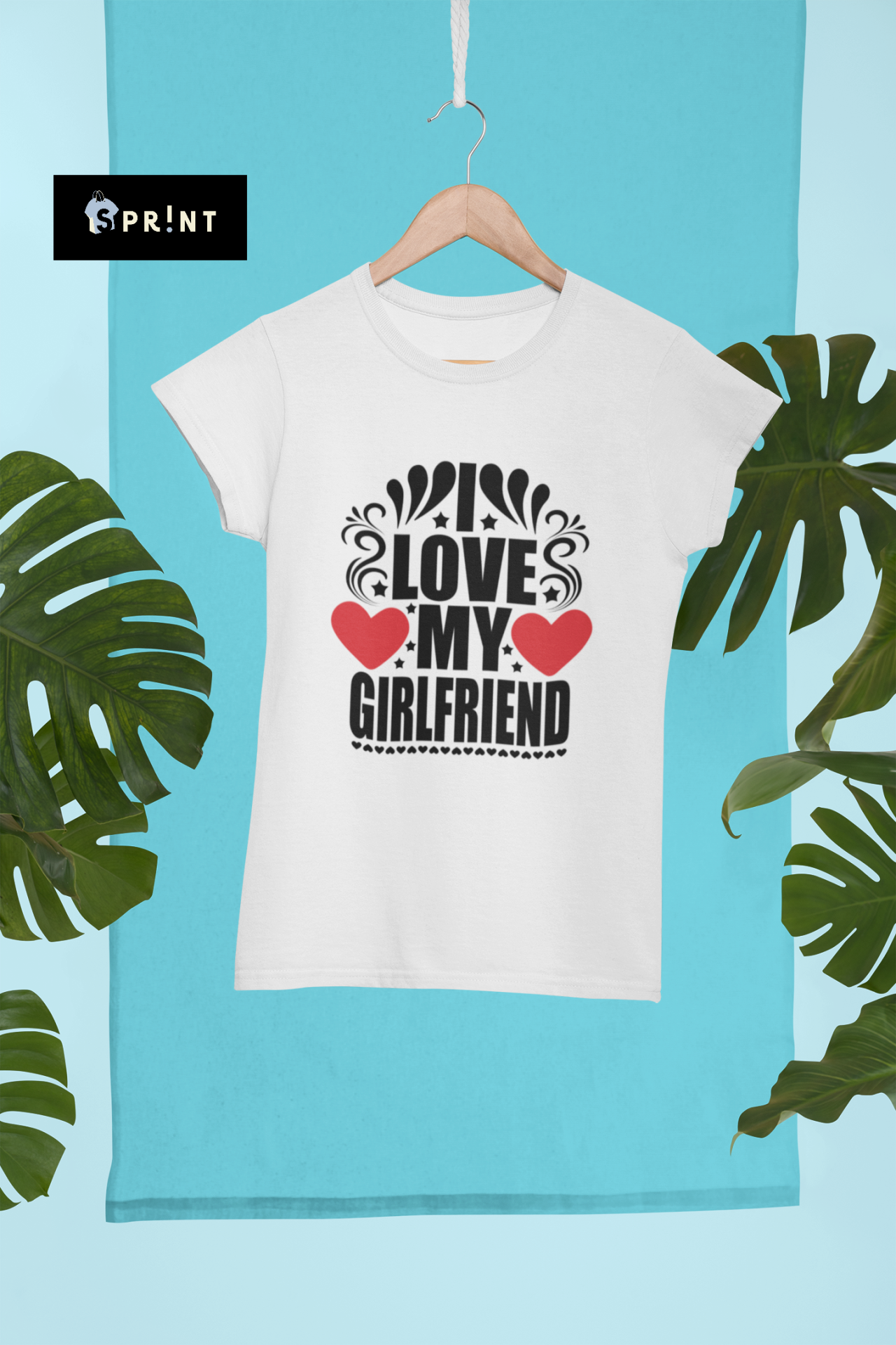 T-shirt branca com texto 'I LOVE MY GIRLFRIEND' e corações vermelhos