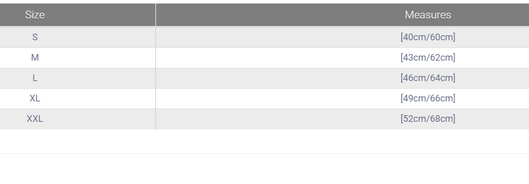 Tabela de tamanhos e medidas em centímetros para diferentes tamanhos S, M, L, XL, XXL.