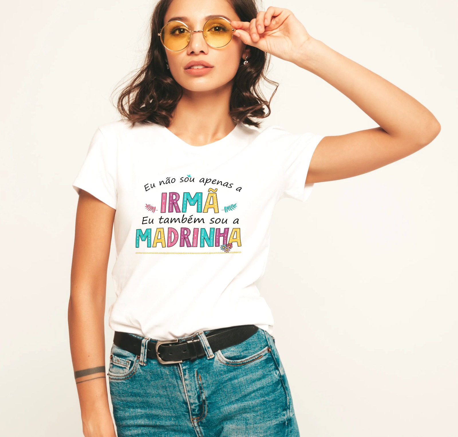Mulher com t-shirt branca com texto colorido em português, calças de ganga e óculos amarelos.