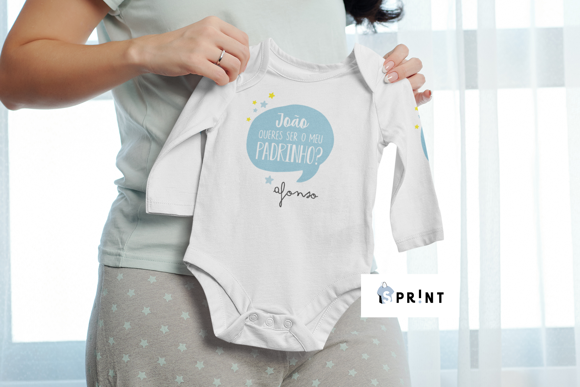 Body de bebé branco com texto azul e assinatura personalizada