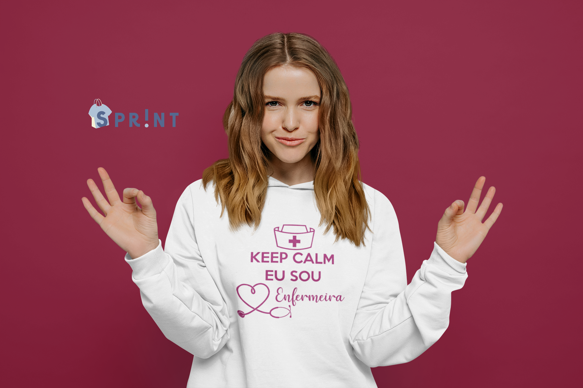Mulher com sweatshirt branca com texto 'KEEP CALM EU SOU Enfermeira' em fundo cor de vinho.