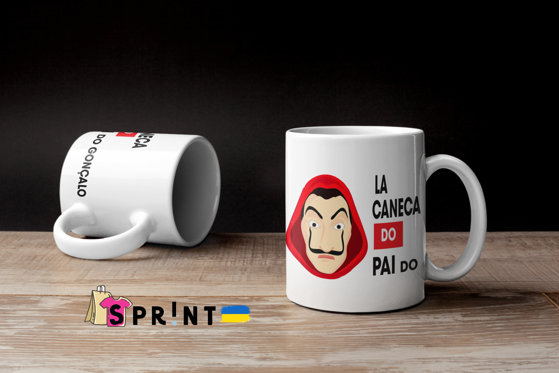 Duas canecas brancas com desenho e texto, sobre mesa de madeira clara