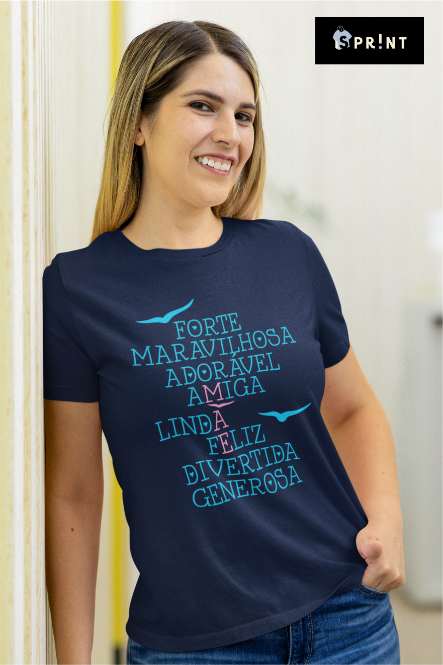 Camisola azul escura com texto positivo em azul claro e rosa.