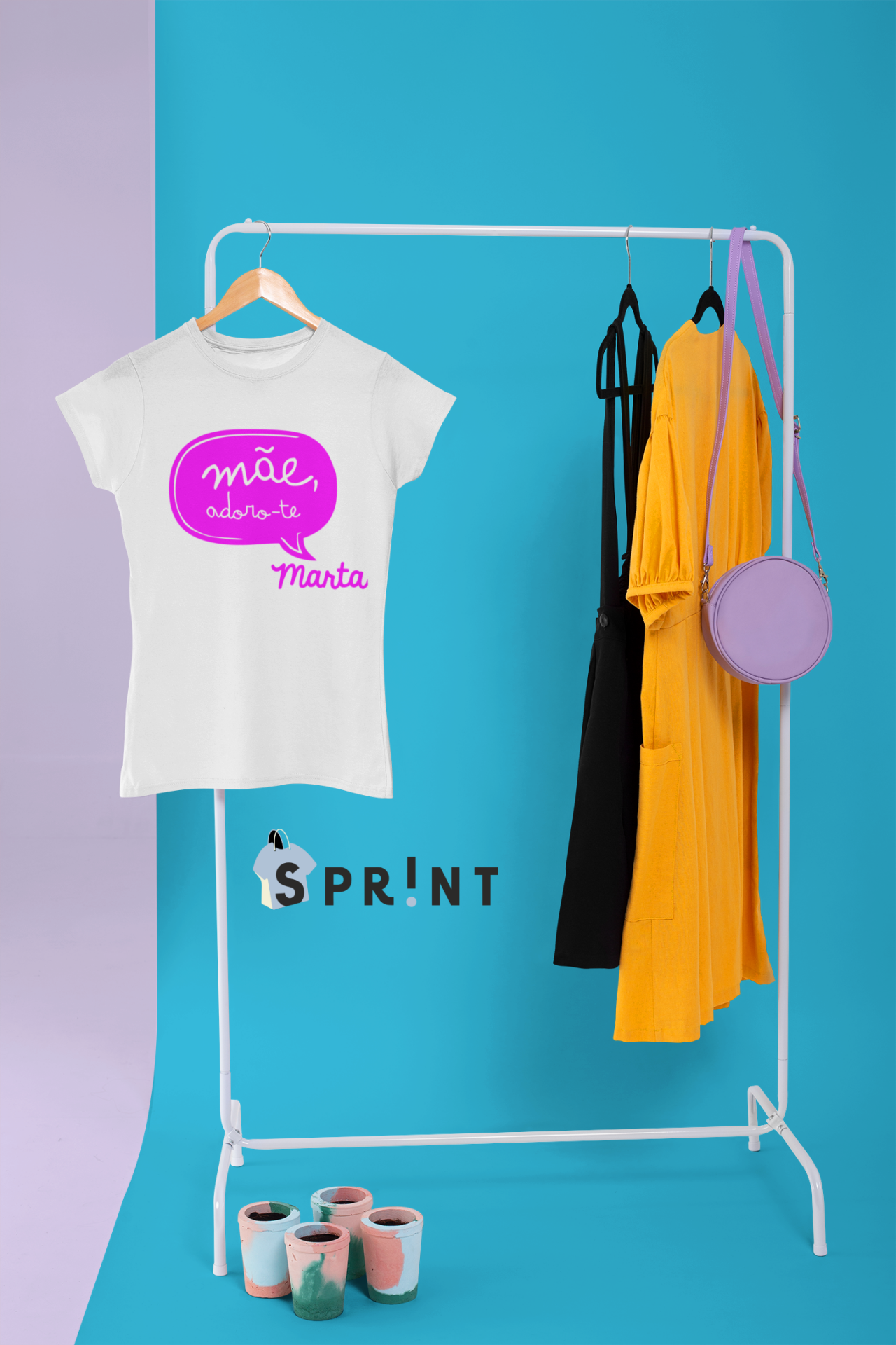 Expositor com t-shirt branca, vestidos negro e amarelo, mala lilás e vasos de plantas no chão