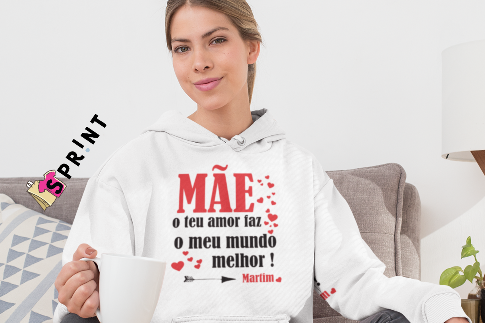 Mulher jovem com sweatshirt branca com texto para mãe segurando caneca branca num ambiente interior confortável.