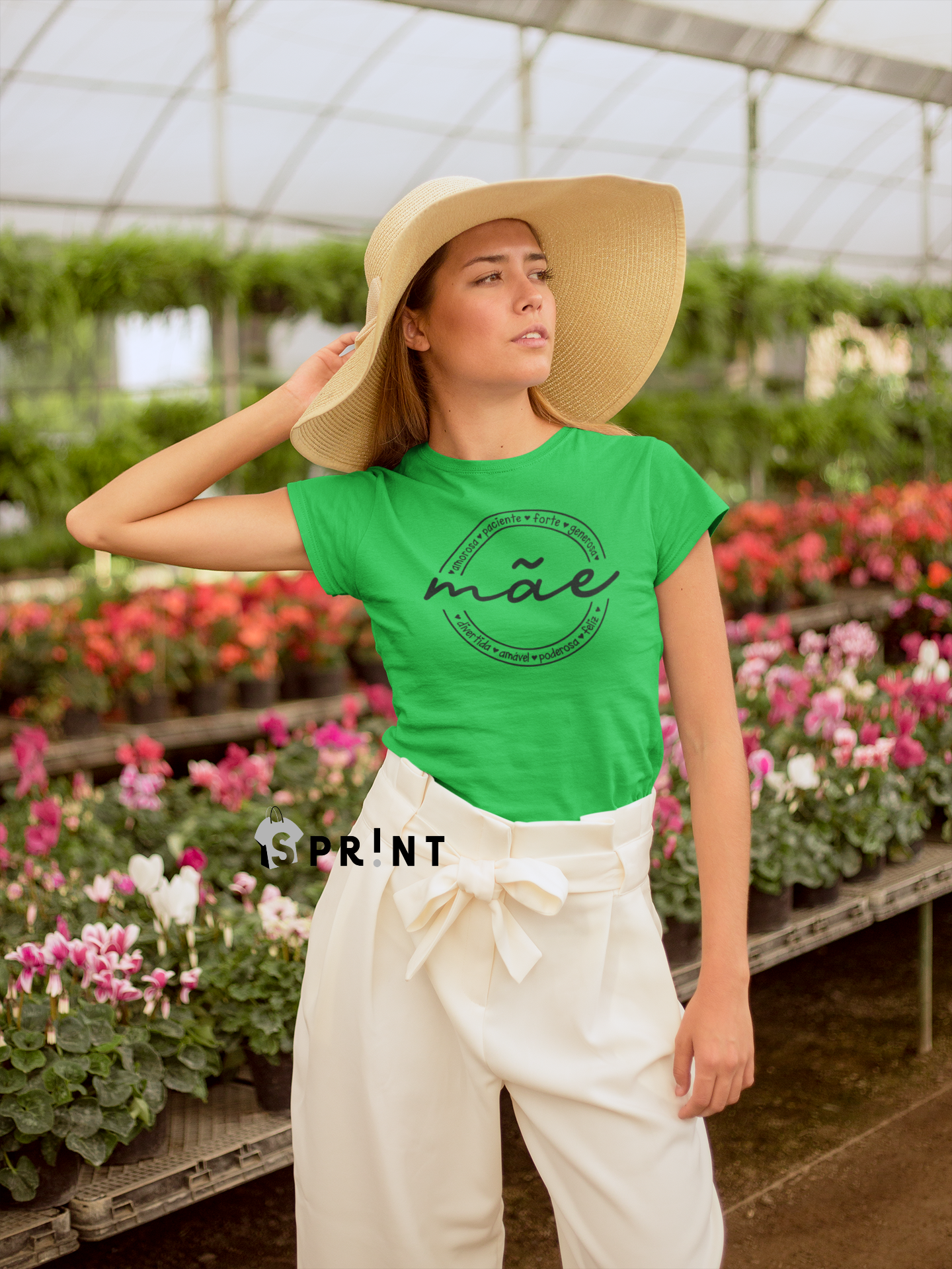 Mulher com t-shirt verde estampada, calças brancas largas e chapéu de palha, em estufa com flores