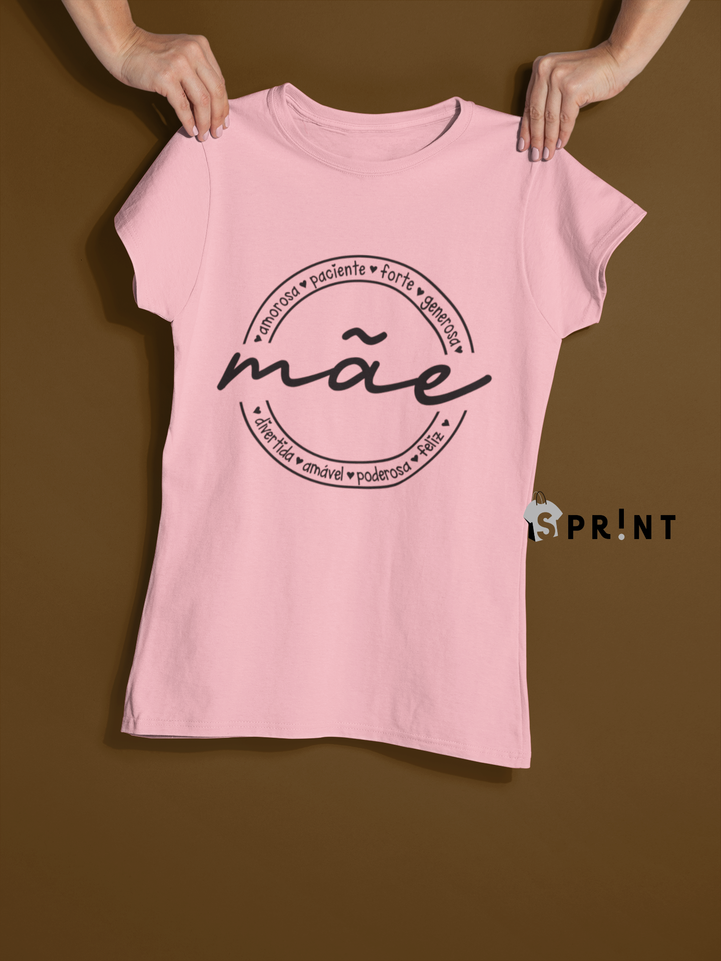 T-shirt rosa com texto 'mãe' em design circular preto