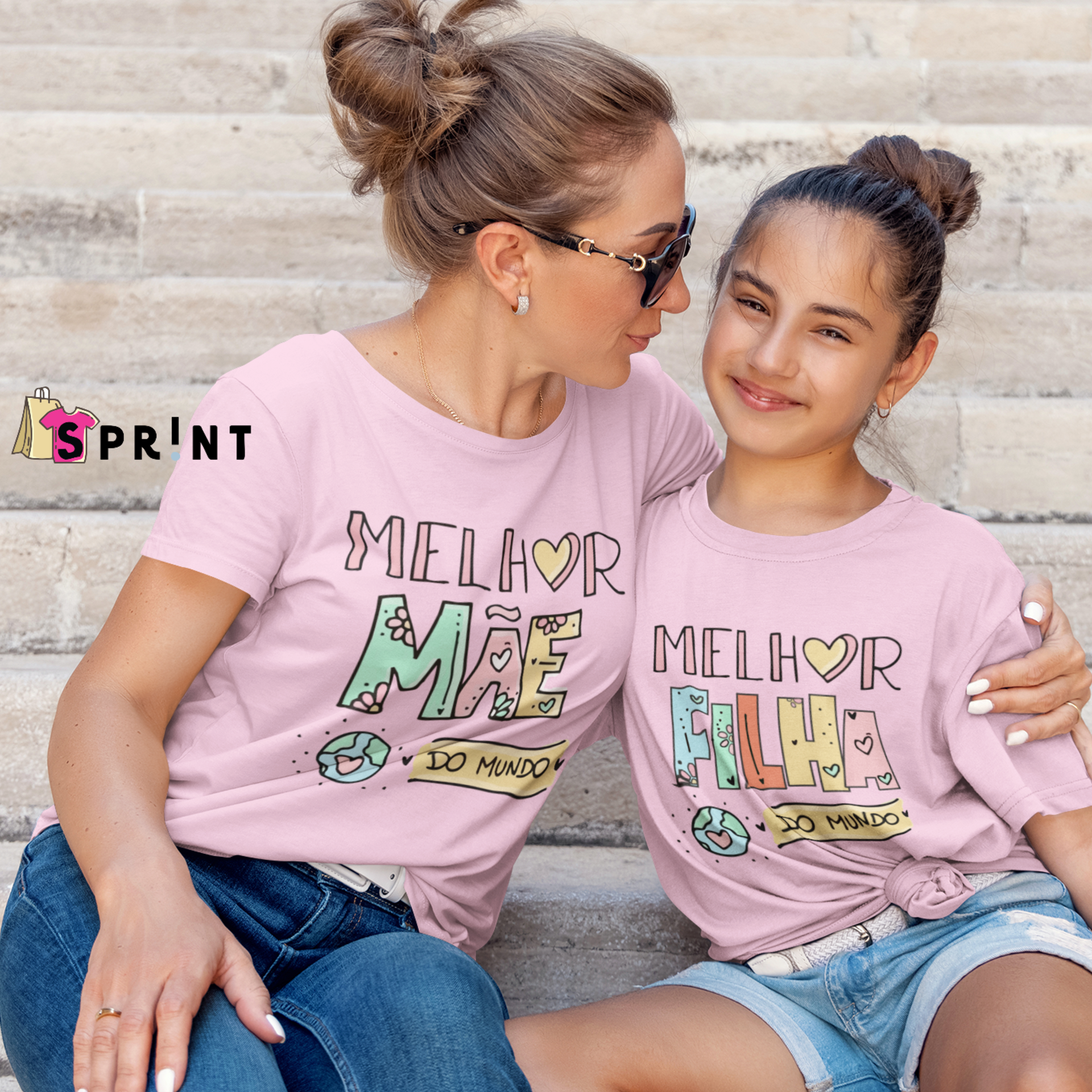 Duas pessoas com t-shirts rosa claro com textos 'MELHOR MÃE DO MUNDO' e 'MELHOR FILHA DO MUNDO' sentadas em escadaria de pedra.