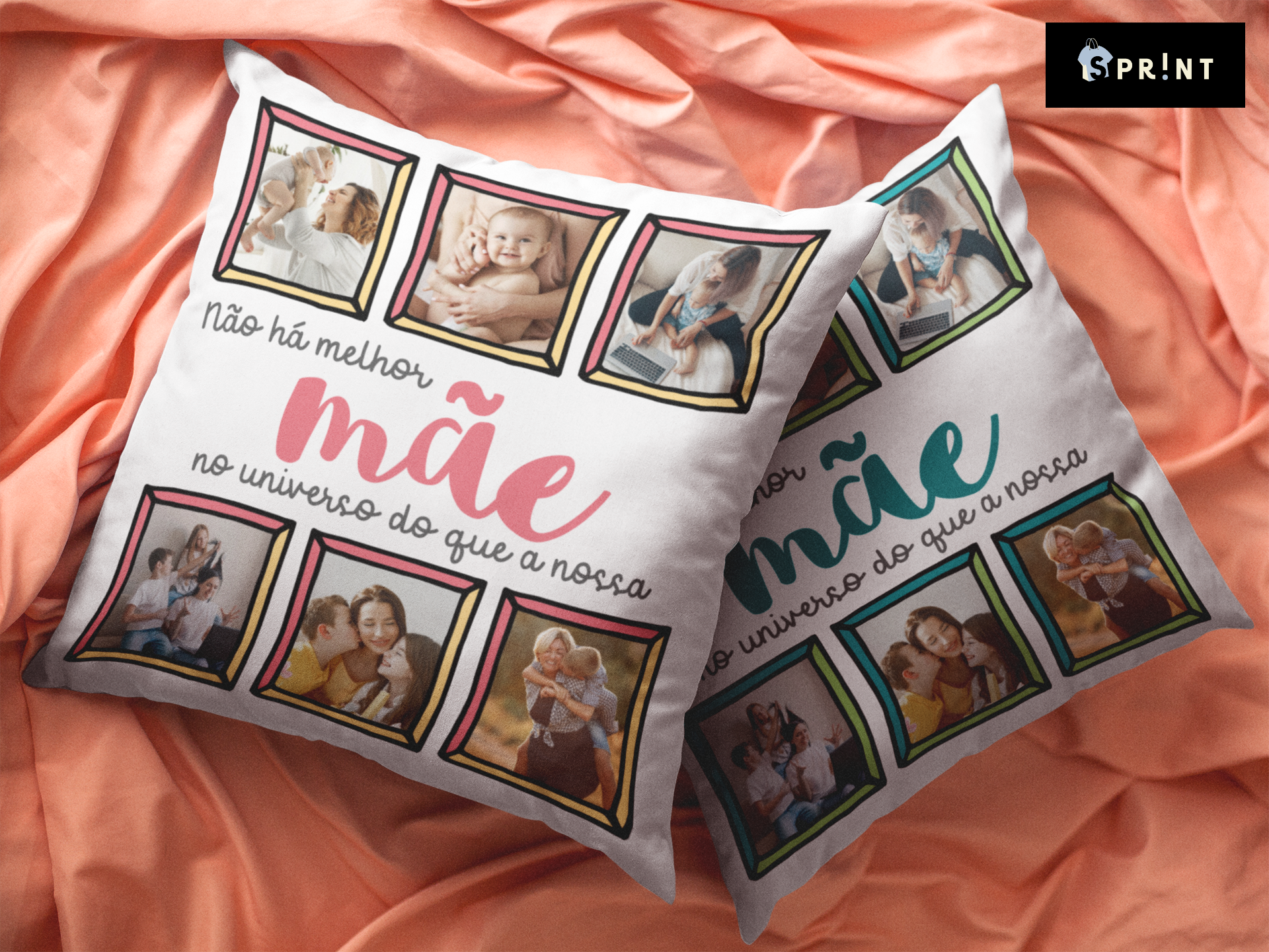 Dois almofadas brancas com fotografias familiares e texto em português sobre fond laranja.