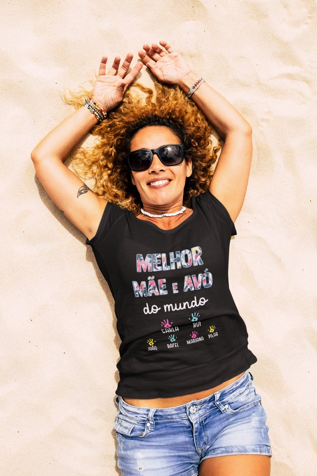 Mulher deitada na areia com t-shirt preta e óculos de sol