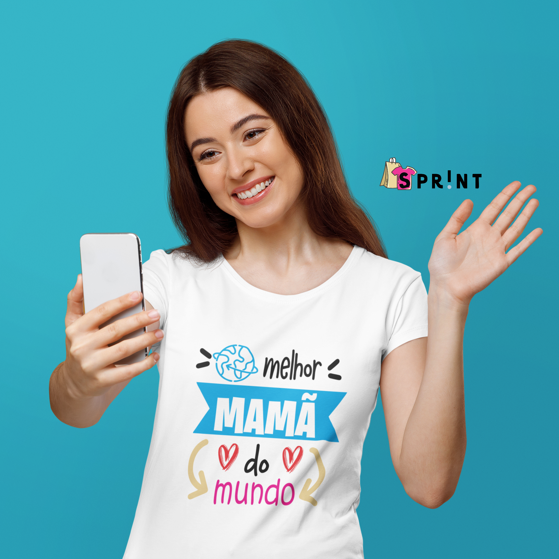 T-shirt branca com texto colorido e mulher sorridente