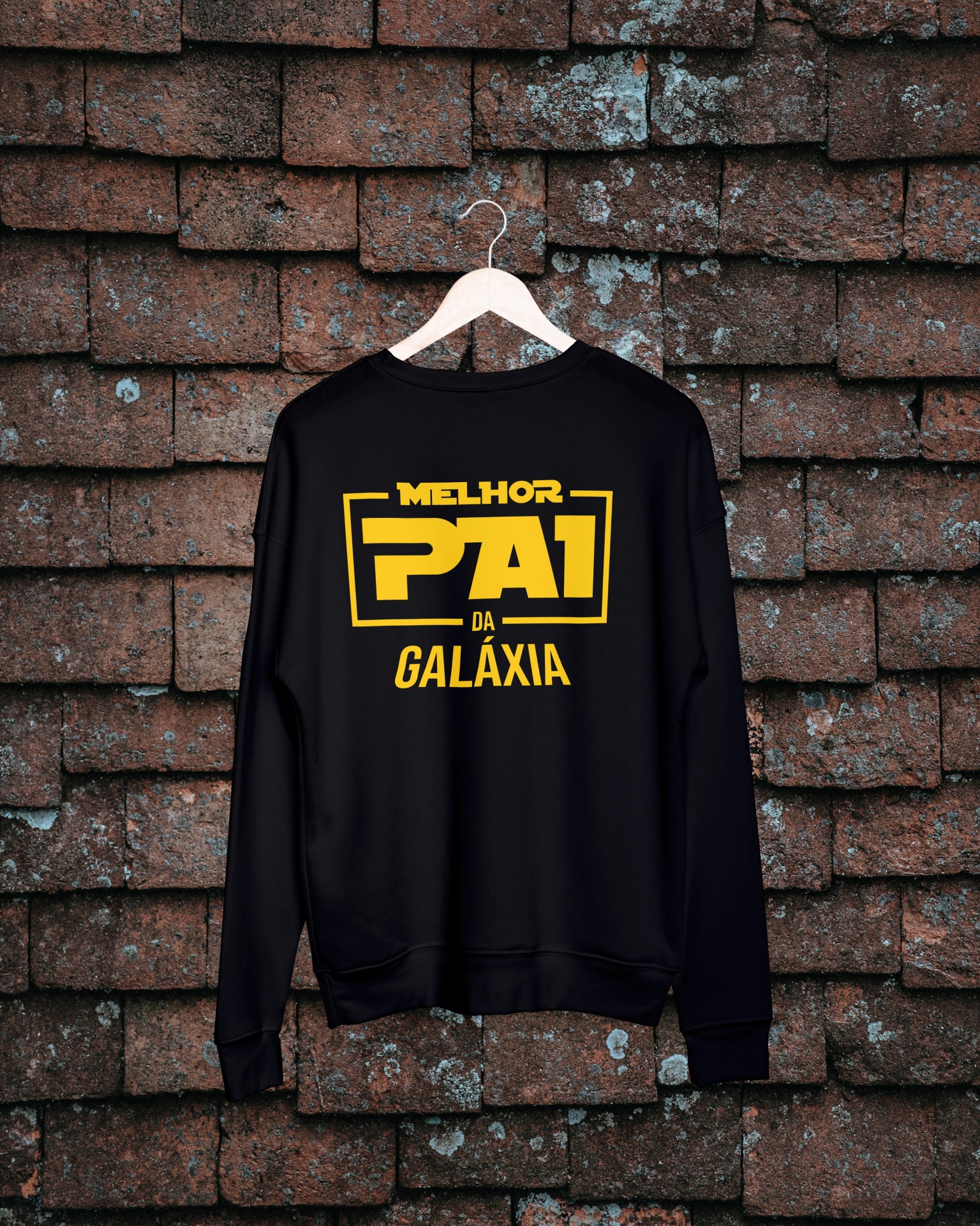 Casaco preto com texto amarelo 'MELHOR PAI DA GALÁXIA' pendurado em cabide de madeira contra parede de tijolos