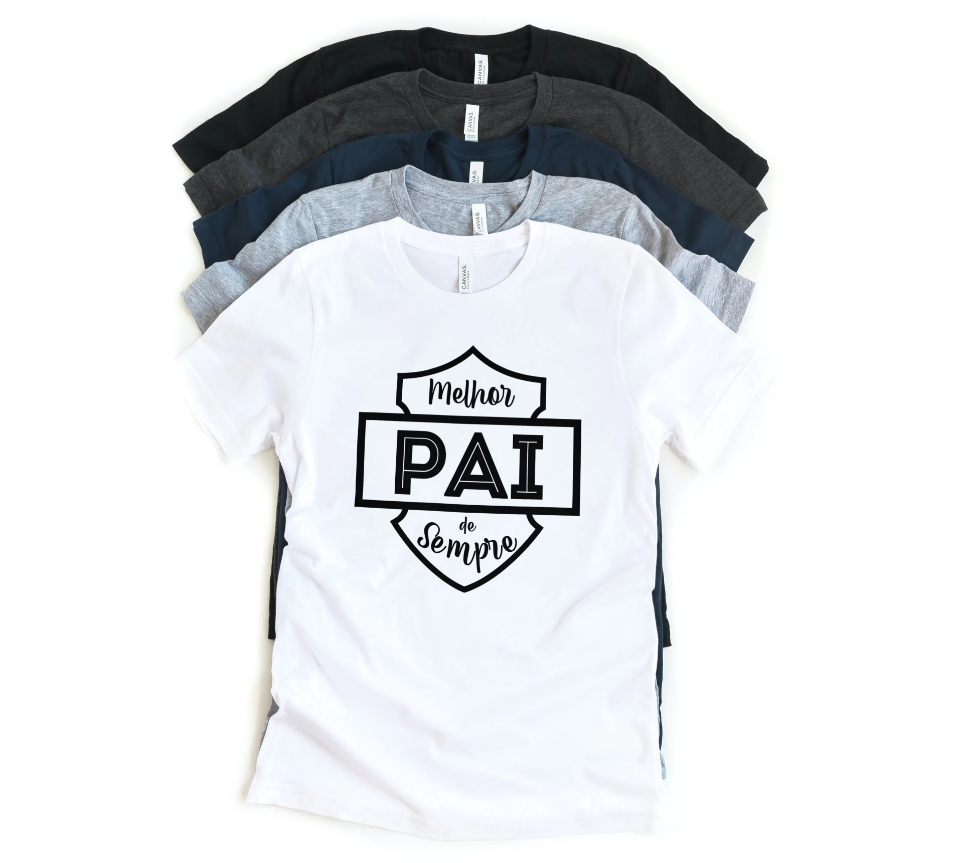 Cinco t-shirts de diferentes cores empilhadas, t-shirt branca com texto preta 'Melhor PAI de Sempre' no topo.