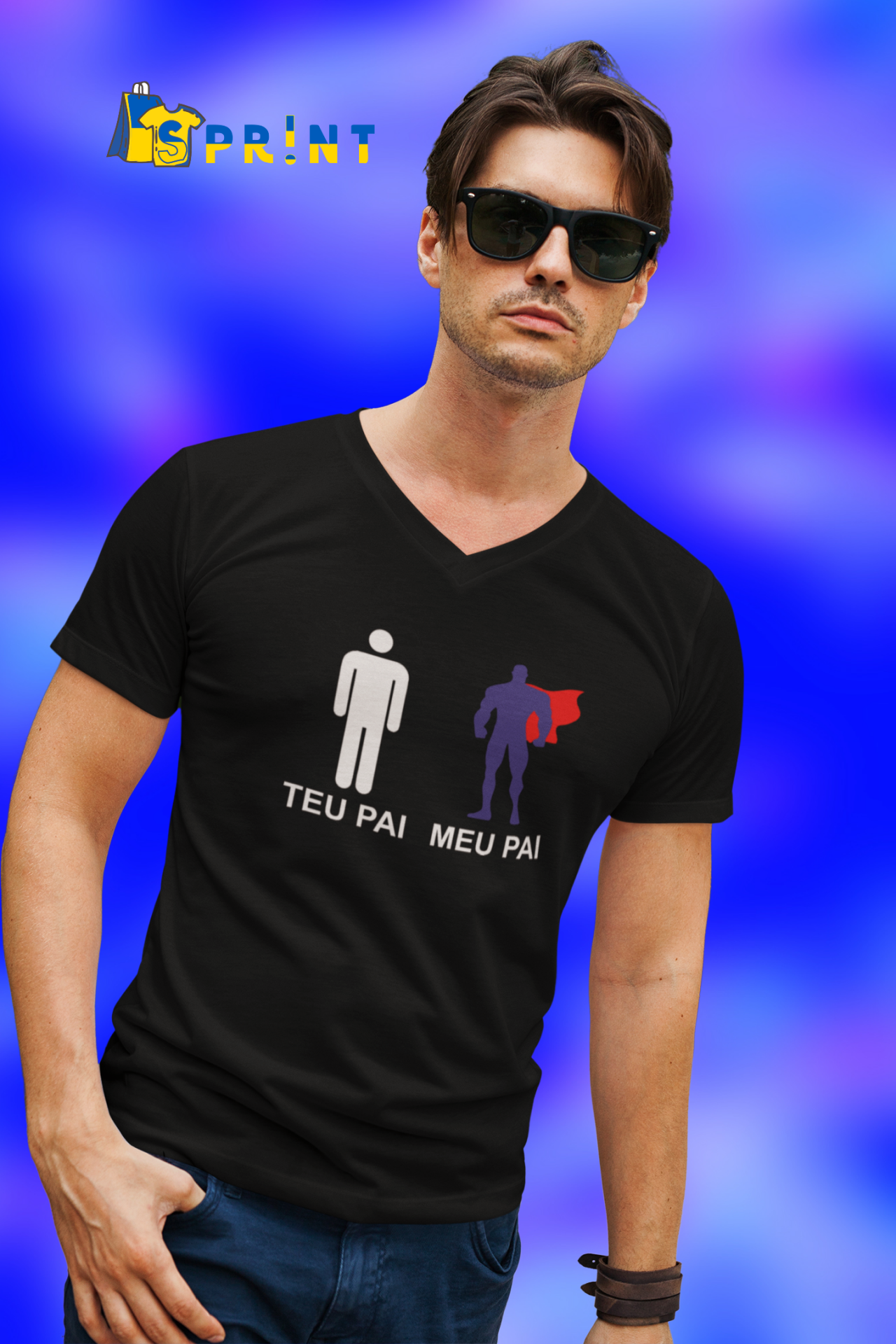 Homem de óculos de sol com t-shirt preta estampada 'TEU PAI MEU PAI'