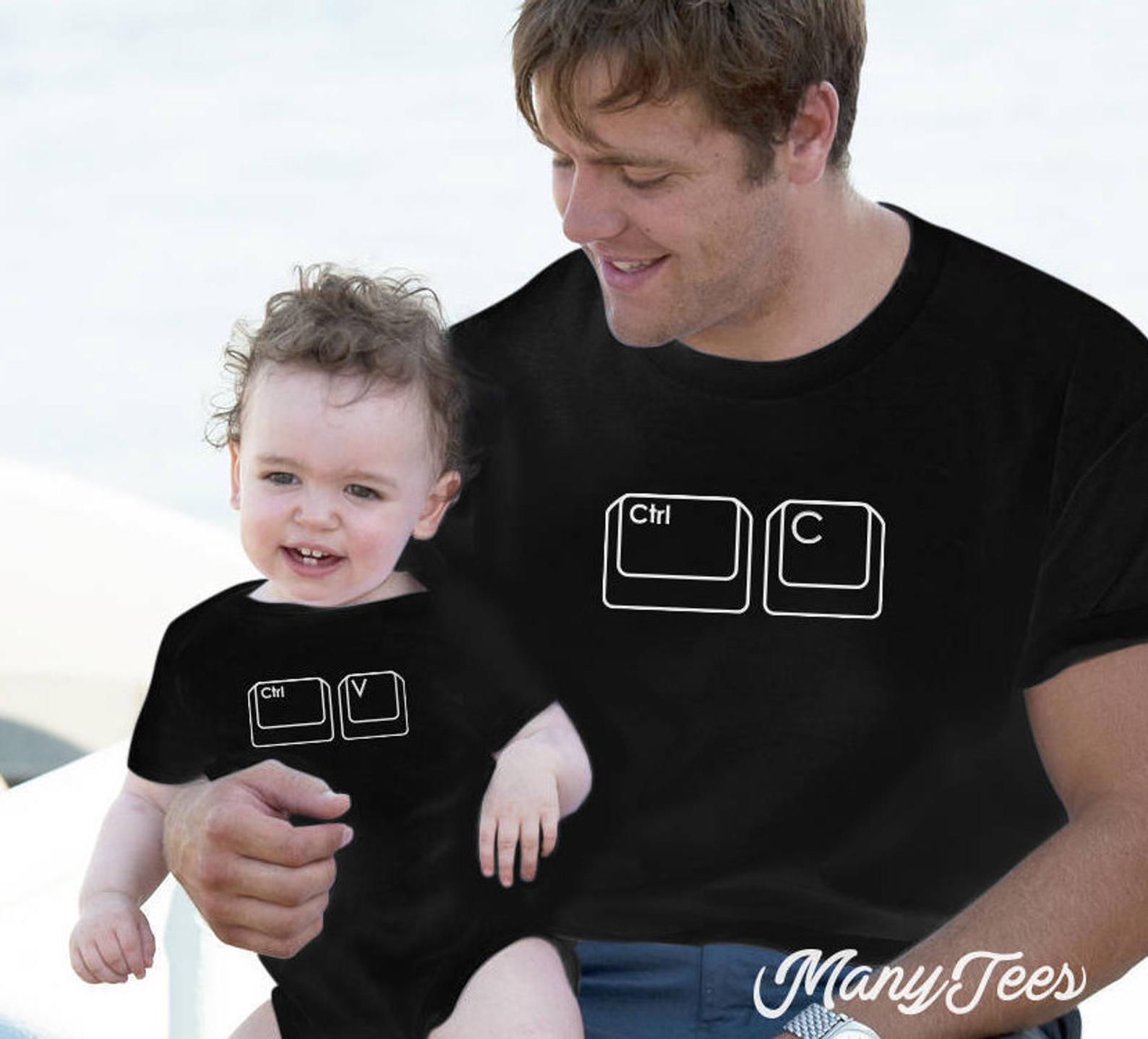 T-shirts pretas com teclas de teclado 'Ctrl' e 'C' e 'Ctrl' e 'V' vestidas por adulto e bebé