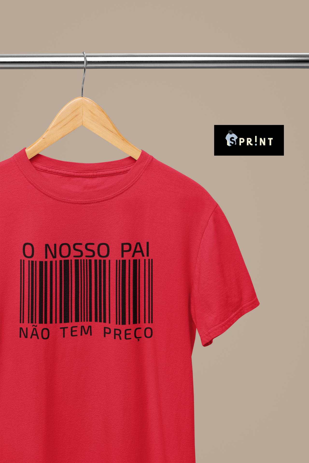 T-shirt vermelha com código de barras e texto preto