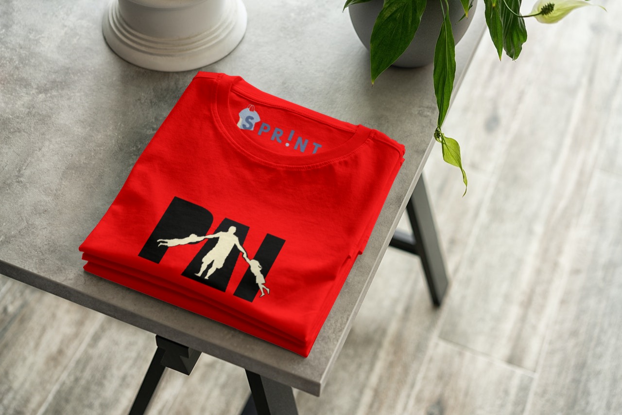 Camisola vermelha dobrada com estampa preta e branca numa mesa com planta ao lado