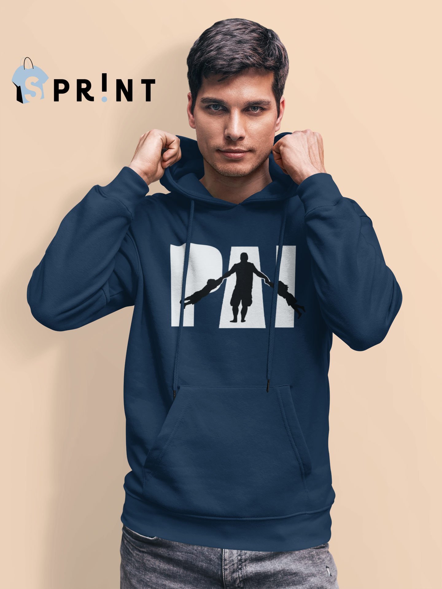 Homem com hoodie azul escuro estampado com letras e silhuetas, fundo bege com logótipo SPRINT