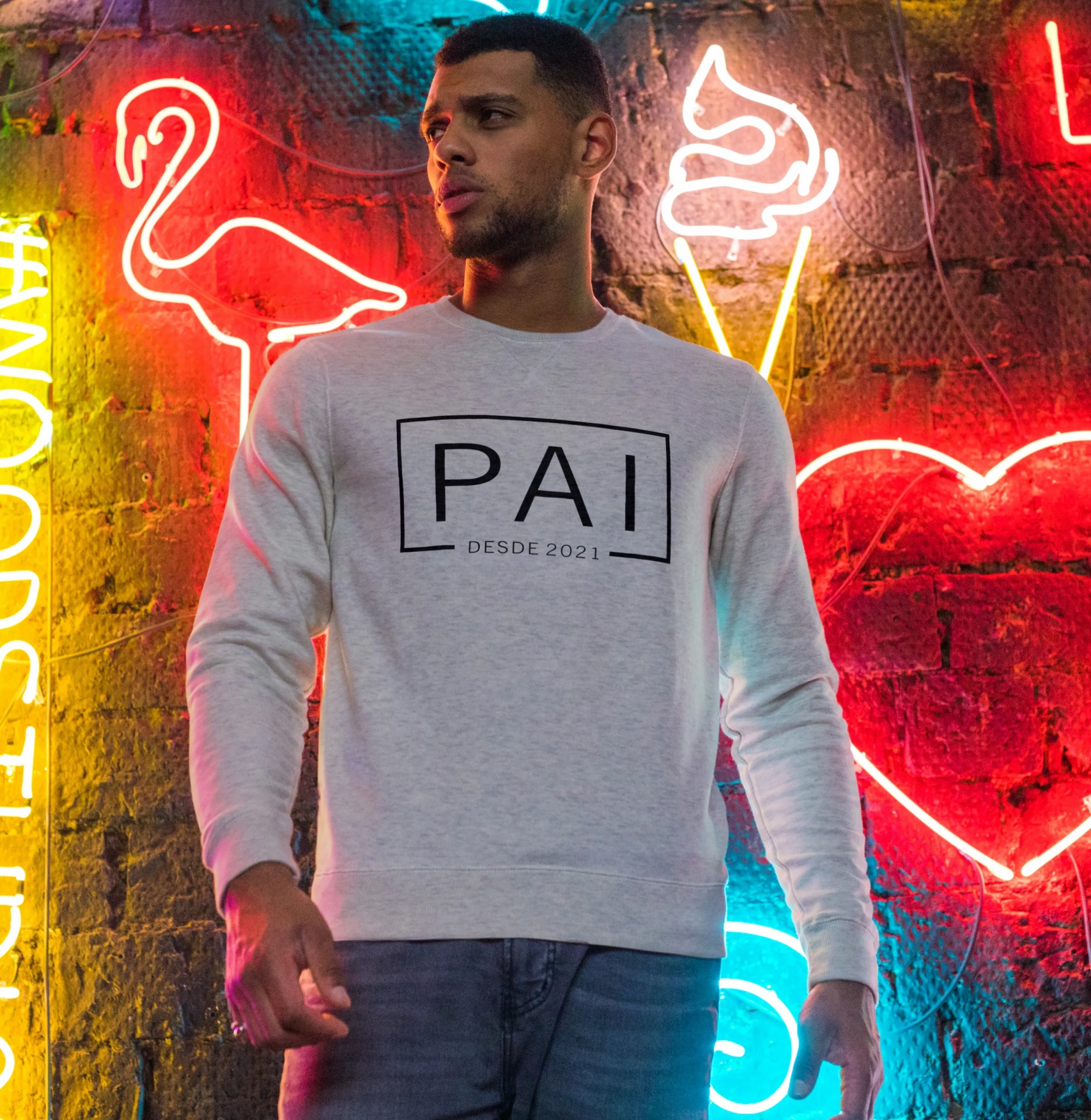Homem com camisola cinza 'PAI DESDE 2021' em frente a parede com luzes neon coloridas