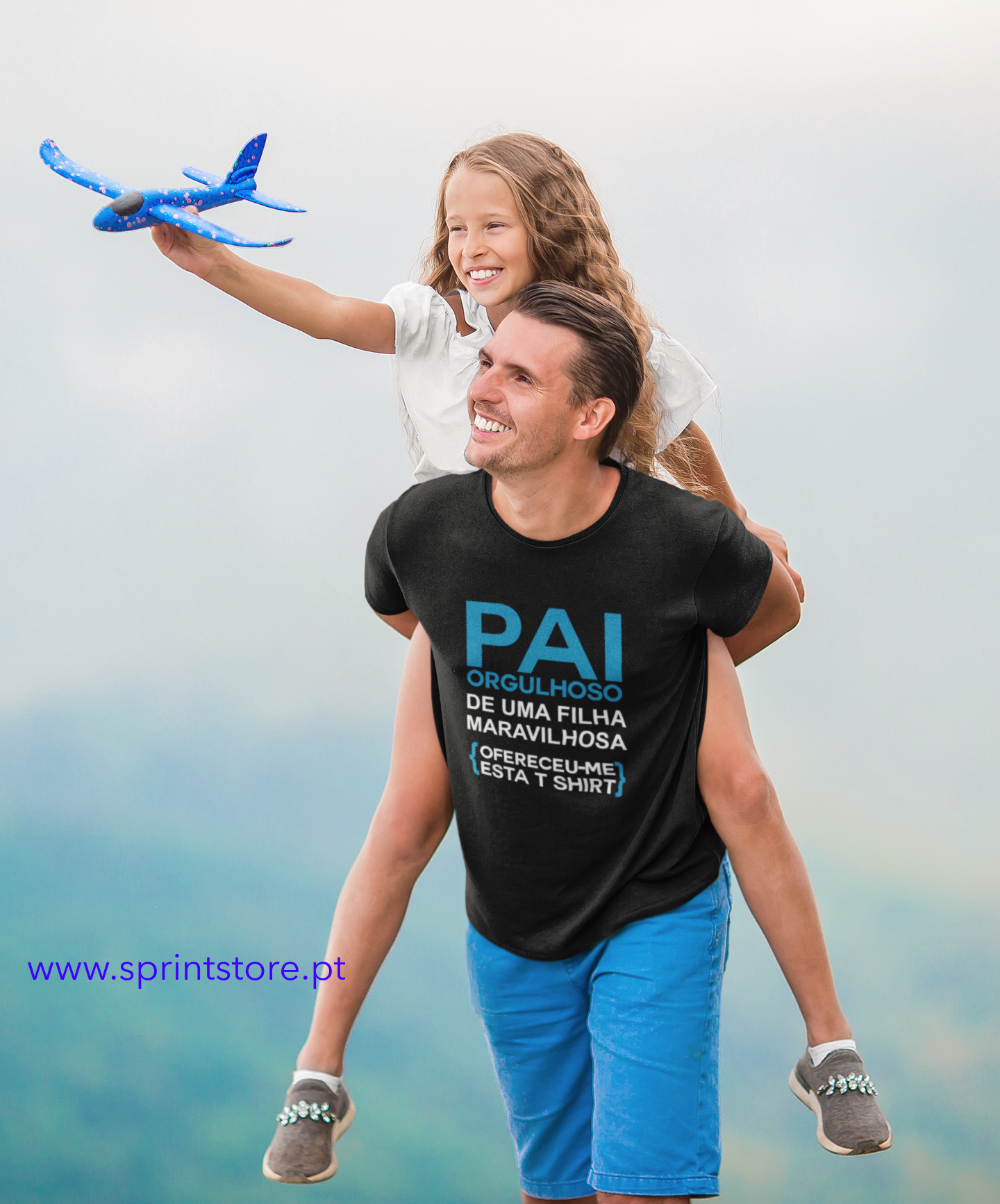 Homem com criança em ambiente natural, ambos sorrindo, menina segura avião de brinquedo azul